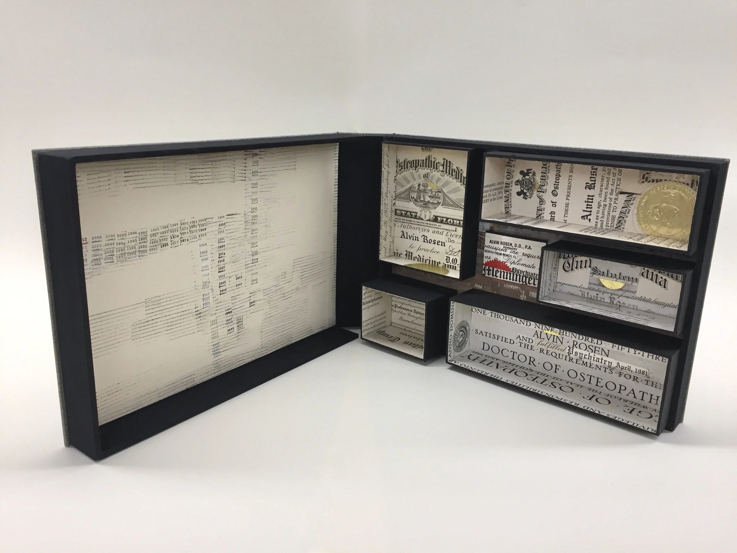 Lifetime Achievements, 2019detail, boxes within box, original documents, rubber stamping, hand coloring