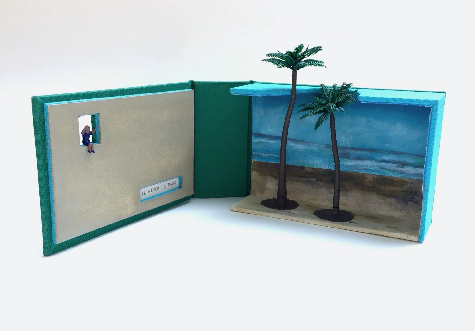 box open: 3.5 x 12 x 2” + trees; painted bookcloth, plastic figure and trees